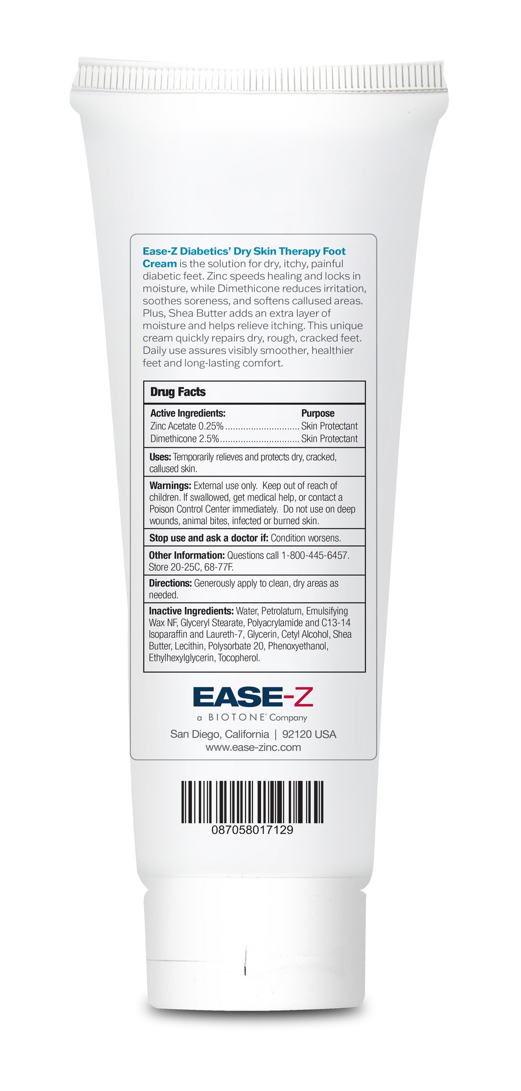 Developed to meet the specific needs of diabetic feet, EASE-Z Dry Skin Therapy Foot Cream uses the power of ZINC to give a strong protective barrier and help heal minor sores and wounds. The addition of Shea Butter, and Lecithin gives deep moisturization and helps repair the discomfort of dry, cracked, itchy feet. Apply to feet to replenish vital moisture and soothe problem feet.